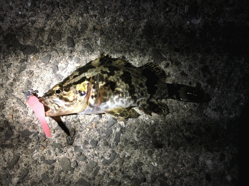 シャクるのを1秒1回ペースでしていると日没時刻直前の19時前にヒット!よく引いきましたが15cmのタケノコメバル。そしてその10分後に同サイズのタケノコメバルが今度はシャクった瞬間にヒット!どちらにも同じなのはかけ上がり付近でのヒットということです。そしてカラーもどちらもナチュラル。