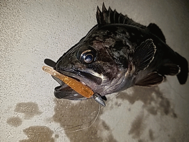 魚の入り具合と活性を見る為、先ずはgh1.5gにマナティー38をセットしアプローチ、カケアガリと海藻が複合しているポイントを表層から順にワインドで攻めますが反応はありません。ボトムワインドに切り替えての一投目、シャクリ後のテンションフォールで『ゴン』とバイト!トルクのある引きをいなし無事キャッチ、綺麗なクロソイです。