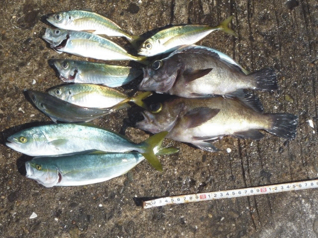 初めに狙ったのはアジ。実績ポイントをライトワインドで攻めていくと小サバに邪魔されながらも何とかアジをヒット。あまりにも小サバが濃いのでジグヘッドは重め、サバの居る上層を抜けるまではフリーフォールでとにかく中層までおとなしく落とす感じで多少は改善されましたがそれでも小サバが濃い・・・。と言うことでアジはここで切り上げてダウンショット×ソルティクローラーのメバリングにチェンジ。ポイントを移動し、捨て石帯の掛け上がりを丹念に攻めていくと小気味良いキュンという引き。釣れたのは27cmの良型メバルでした。その後25cm級を追加。そうこうしていると目の前で何度かナブラが立ったのでワインドに切り替えた所、ナブラの正体はワカシであることが判明しました。結局、アジ6、メバル2、ワカシ2を釣ったところで納竿としました。今回はアジングから始まり、メバリング、ワインドとフルコースで楽しむことが出来ました。
