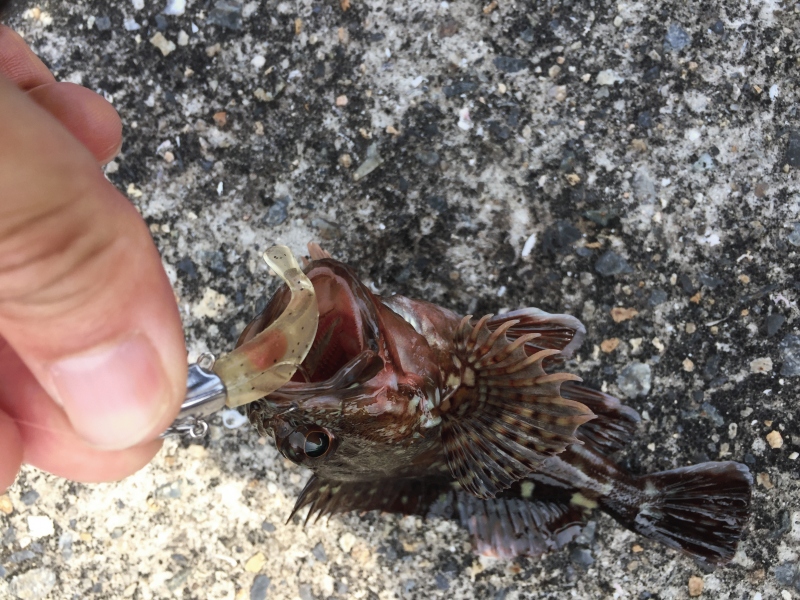 マナティ38アイスゴビーをセットした1投目、15センチ程の真っ黒なガシラ。キーパーサイズ未満で即リリース。