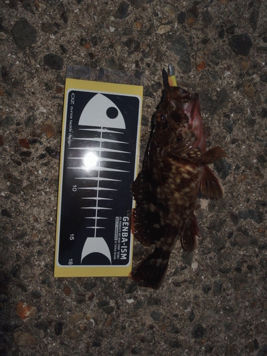仕事終わりにロックフィッシュ狙いに南港へ。暗くなってきた頃マナティー38のケイムラピンクファントムでスタート。 底につけて軽く浮かせワインド、そしてそこでステイをスローに繰り返すとヒット。この方法でタケノコメバルを2匹キャッチ。カラーを#BBHに変え同じ方法で探ってると良型のガシラがヒット。ここで終了としました。