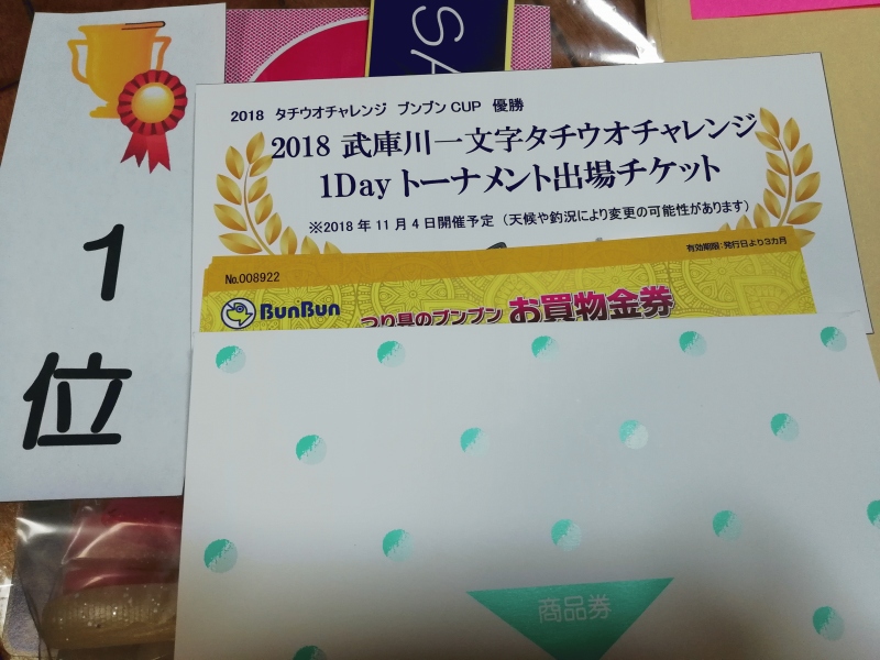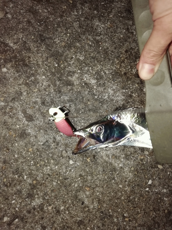 先ずはZZ-STAP30gをキャストし続けますが異常なし。16時にワインドへ変更ZZヘッド5/8oz+マナティー90に、カラーローテーション(MT-1,5,K14,K21,lumi1)を繰り返しますが反応なし周りではタチウオがガンガン釣れています。風向きが西風から北風に変わったタイミングでZZヘッドを1/2ozへルアーをピンテー105(K21)に変更しカウント7からよそ見をしながら軽くシャクっていると待望のヒット!93cm,F4の良型(今シーズン初タチウオです)。その後はフラップに変更3匹(75cmくらい)追加しストップフィッシングとなりました。検寸の結果幸運にも1Dayトーナメント出場権をゲットすることができました。