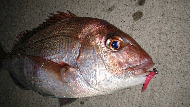 重さを合わせ、カッティングベイトでボトム付近を探っていると、マダイがヒット。久しぶりの魚の引きでした!