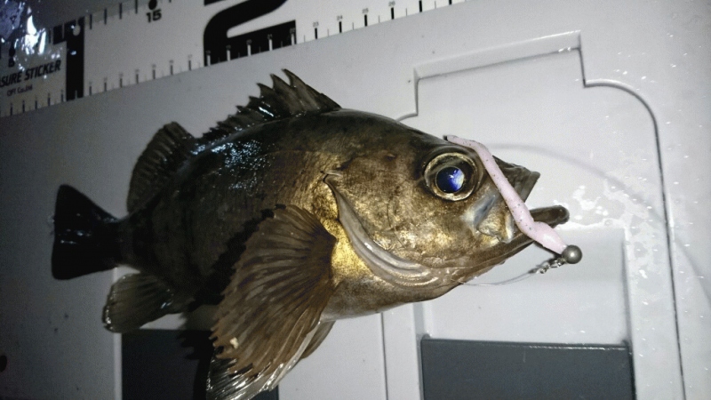 一番試してみたい場所の磯へ行くと、数投目でヒットします!思った通り、暗い場所でのコットンキャンディーへの反応はいいようです。