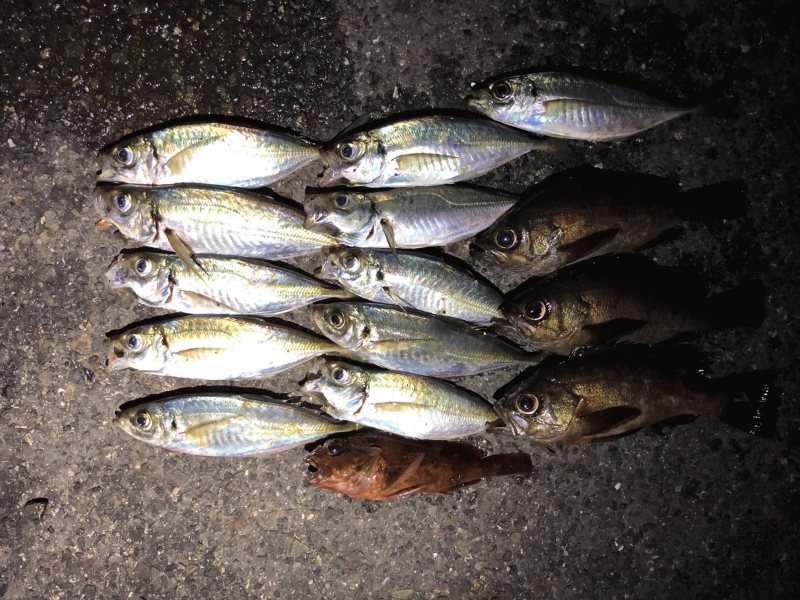 そこで前回の大会でいただいたアジつくしのテストカラーにチェンジ、しかし本命のメバルが釣れだしたのは周りがすっかり暗くなってからでポツポツと3匹キャッチ、その間もアジが釣れ続け気がつけば時間も残りわずか、迎えの船が来るギリギリまでキャストして終了!