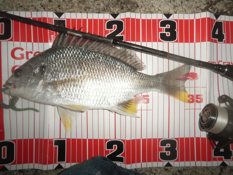 その後は、雨が強くなり、雷が鳴ってきた終了間際に、同じポイントで36cm程のまたまた綺麗なキビレが釣れてきました! カッティングベイト3インチ、グッジョブですね。ちょこっとでかなり楽しめますね~。(^-^)