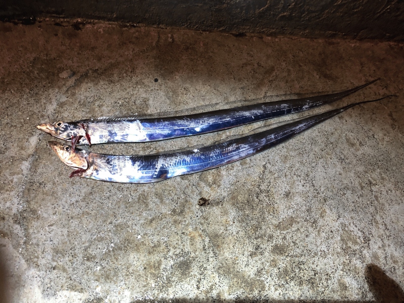 夕まずめからの太刀魚狙いで舞鶴湾へ向かう事に。ところがメイン道路が事故渋滞で現地到着が大幅に遅れ21時前から、舞鶴湾では定番カラーのホワイト系のレッドヘッドでワインド開始。ボトムから中層を4回シャクリとホールの繰り返しで誘うが異常無し。そこでルミノーバ レッドヘッドに交換するとホール時に念願のバイトがあり、フッキング成功しミニ太刀魚をゲットした。その後アシストフックも異常の無いまま時は過ぎ、帰る間際に1匹追加して納竿した。