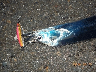 フルキャストしてボトムをとりますが、着底まで30カウント!さすが舞鶴湾。3回シャクッて食わせの間を繰り返すこと約1時間。フォールからのアクション開始時に根掛かりのような手応え。根掛かりか?タチウオか?はたまた他魚種か?慎重に寄せてきて引き上げたのは銀ピカ!二兎のうちの一兎ゲット!