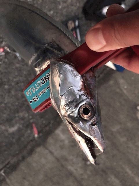 中潮、程よい風、潮の色もいい感じ。明るい時間帯はアジ、青物を狙うも反応なし。どうも前日辺りから水温が下がったようです。16時頃からタチウオにシフトチェンジして17時を過ぎた頃に隣におられた大将から表層でバイトがあるとの情報を。さっそく Z Zヘッド1/2oz.ピンドラのK21を遠投しカウント5で1本。F3でした。続いて同じ条件に来た強い引き込みで上がってきたのがF4、97.5cmの良型でした。その後も同じカラーのピンドラ、ワインドで2本追加。日が落ちてFLAP、ピンドラのLumi1のヘッド部分のみを光らせて追加出来たのが、この日最大の99.5cmでした!(写真忘れてました)