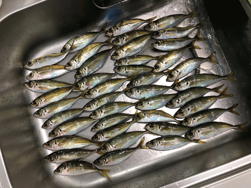 いつもと違う常夜灯の効いているポイントに入りマゴバチのマジックグリーンをセットしてキャストすると活性が高いせいか早速表層で反応あり♪ 20センチ無いぐらいのサイズのアジが1キャスト1ヒット状態でキャッチ!