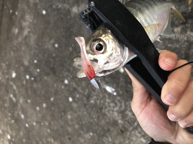 先日、浦さんがライトワインドで良型アジとガシラを仕留められていたので私もタチウオの時合いまで試してみようと、たまや渡船さんにお世話になって15:30便で関電波止場へ。当日は風が強く軽いジグヘッドでは底が取れないためデルタマジック3.5g+WIND SHAD40 SP-3の組み合わせで底付近を丁寧に探っていくと当たる当たる笑 小型のアジが襲いかかってるようです笑 ワインドの集魚力は恐るべしですね笑 それでもジグヘッドが3.5gと重いのでフッキングするのは全て25cm級の大型アジだけでした^_^
