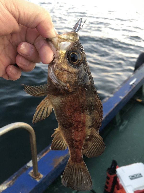 そんな1匹目はなんと良型のメバル!ワインドシャッド40のフォール中に、モゾモゾした引っ張るようなあたりで、上がってきたのは24センチのメバルだった。
