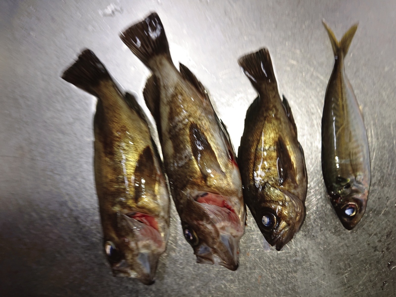 漁港内常夜灯回りでは、稚魚、カマスの稚魚らしきものが、泳いでおりメバルが、パチャパチャしています。ジグ単で表層を引いたりテンションフォールで探ると可愛いメバルが、ちらほら釣れてきます。