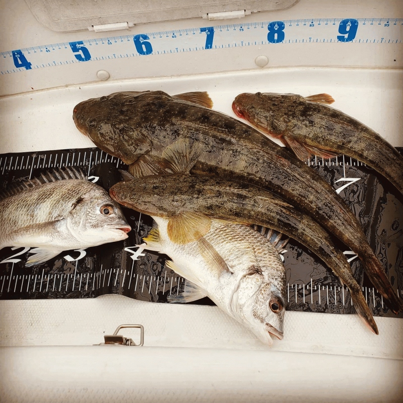 一流し目に久しぶりに明確なバイトがあり、ドラグも走る。釣り上げると60オーバーのマゴチ!すぐにキビレも追加し雨風が強くなってきたため帰港。