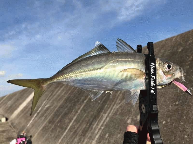 ボトム付近を探ると、中々の引きで上がってきたのは良型アジ!ここからアジ祭り開幕♪