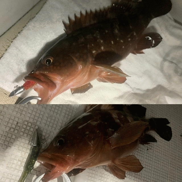 釣友とハイシーズンのボートアコウ便に行って来ました。お世話になったのはボトムノックさん。18時過ぎ出船、ポイントに向かいます。使用ルアーはムゲンヘッド10gにマナティー60mmMT-4着底させ軽くダートさせますと…「キンッ!」と金属的な当たり‼ドラグを出しなかなか上がって来ないと思ったら45cm UPのアコウでした。ライトワインドに持ち替えるとワインドシュリンプ41で25cmほどのガシラはエンドレスで掛かりますが、全てリリース。アコウも35cm以外は全てリリースとしました。ラスト5分で、またまたアコウがヒットかと思いきやまさかの28cmのメバル。なかなか良い引きをしてくれました。