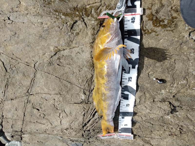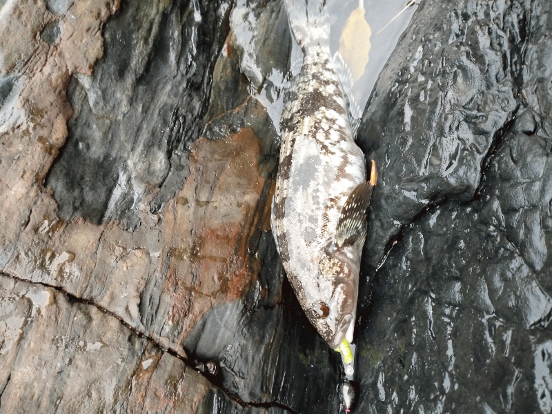 更に女川の地磯へ移動し、夕マズメになりカッティングベイト3インチのチャートに変えてバイト!