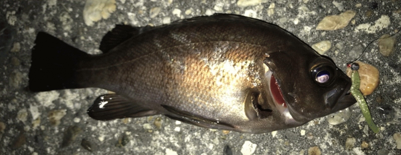 邪魔にならないようにマゴバチMB-10のジグヘッドからスタート。軽量ジグヘッドのかなりスローなリトリーブでコン!とアタリ。早速のヒットは20センチクラスの良型。