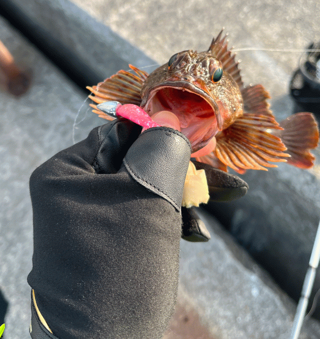 そんな中、横で釣りをしている師匠は既に何匹も魚を釣り上げており、初めての釣果“0”!?と心が折れかけいましたが、気持ちを切り替え、師匠と同じスリット攻撃で漸く魚に出会えることが出来ました。