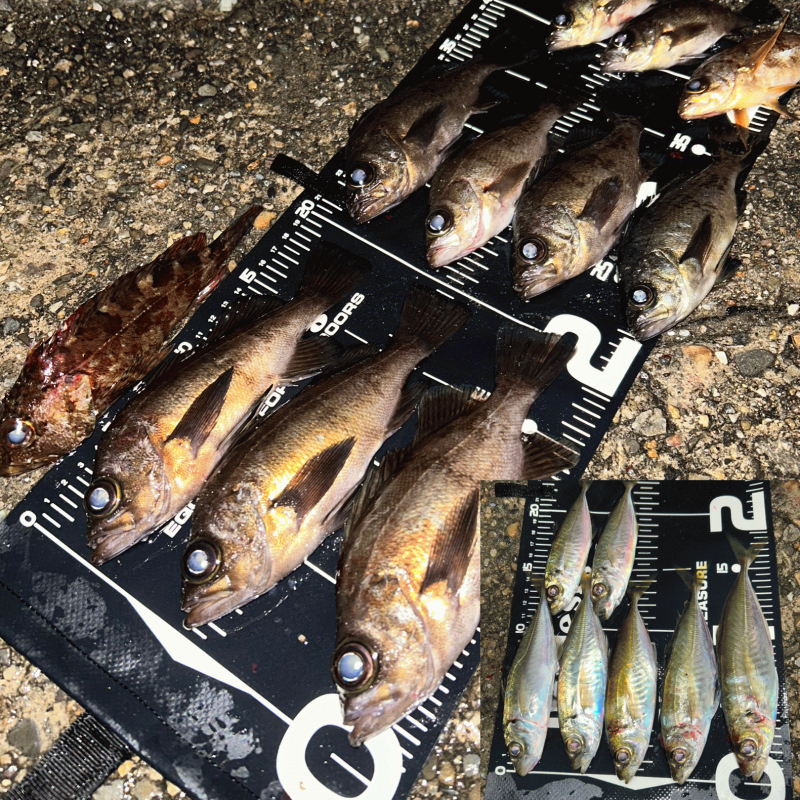 すると、いきなりアジ!小アジ連発!マゴバチ丸飲み。フォール中のチョンチョンでヒット!で、暗くなってから、ガシラ、メバル登場で誰が言うたか?ライトゲーム御三家達成!ガシラは1尾だけやけど、、アジ、メバルは、スーパーグローとマジックグリーンに好反応でしたよ。メバルは、フォールと、巻き巻きデットスローで良く釣れた!