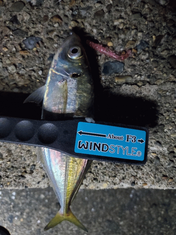 アジだったのでちょっとショックでしたが、気を取り直してキャストを続けているとようやくHIT。今度はバラスまいと抜きあげるとこちら20センチほどのアジでした。