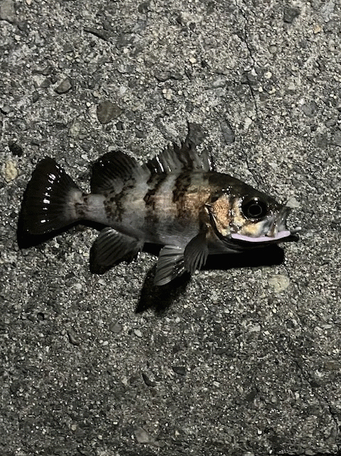 メバル狙いでいつものテトラ帯へ、0.7gジグヘッドにマゴバチマジックグリーンをセット。潮位が低く月も高かったため、着水後カウント10でスローリトリーブするとアタリが、なかなかの引きでしたがかかりが浅く1匹目痛恨のバラシ。